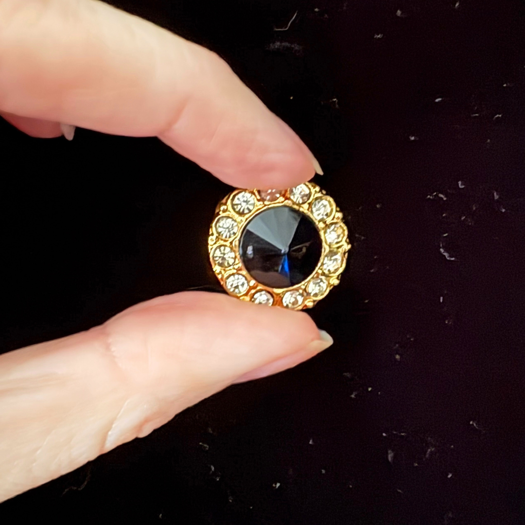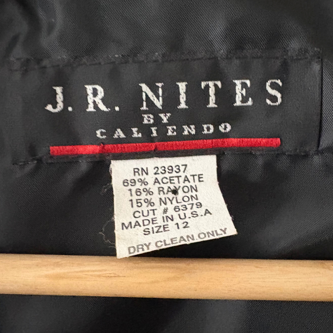 Despite being an acetate/rayon/nylon blend, this might be the softest velvet you've ever touched. Tagged a size 12 by the brand J.R. Nites. Features heavy duty shoulder pads and eye catching, rhinestone encrusted buttons.