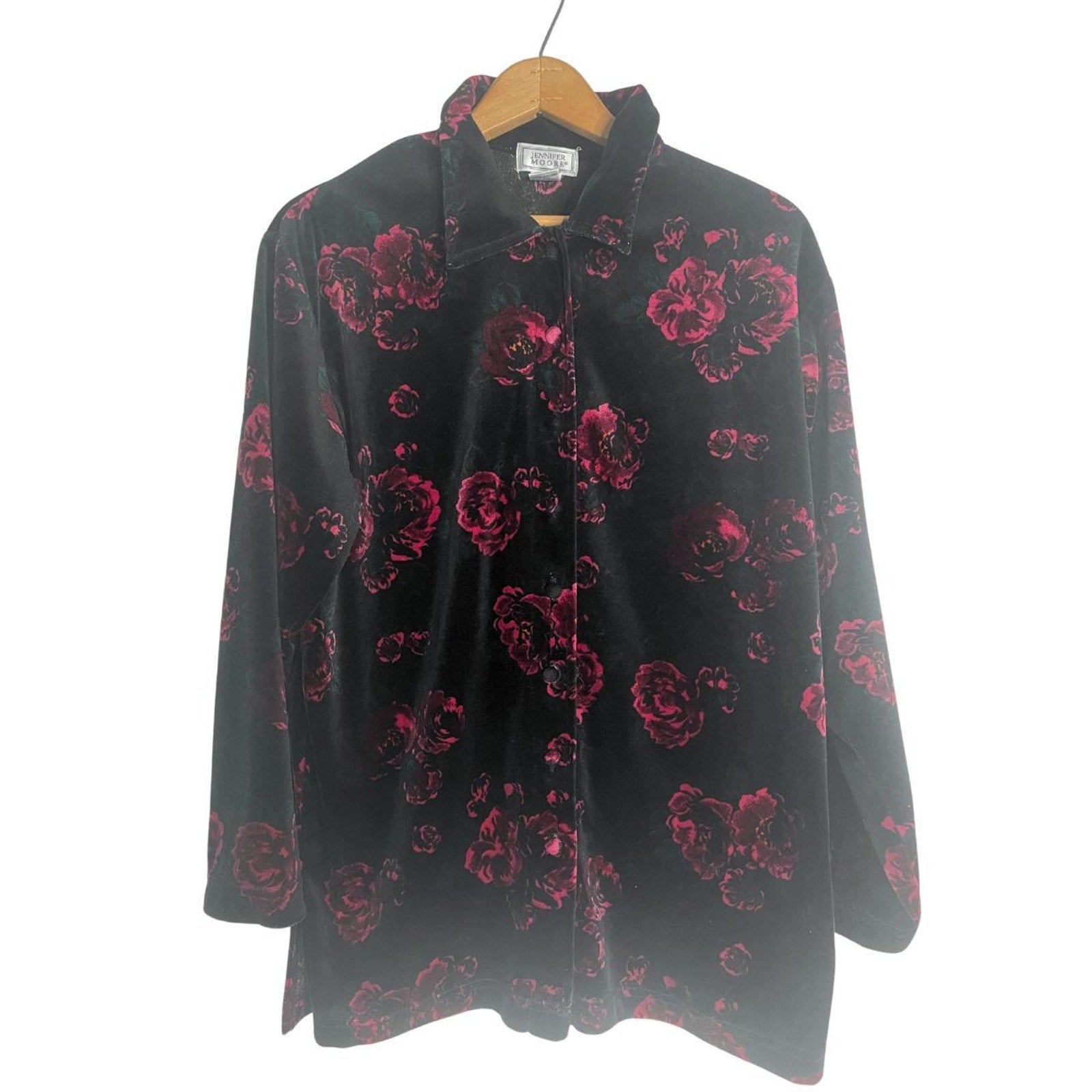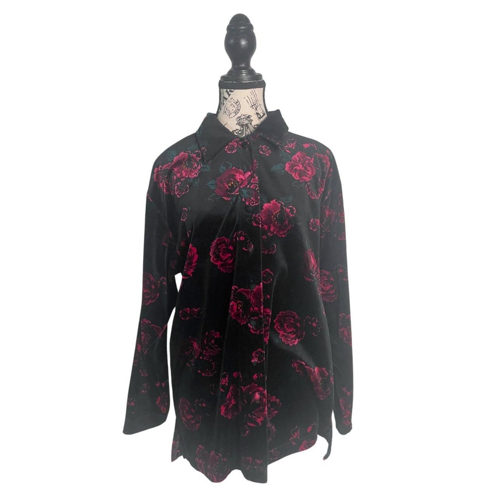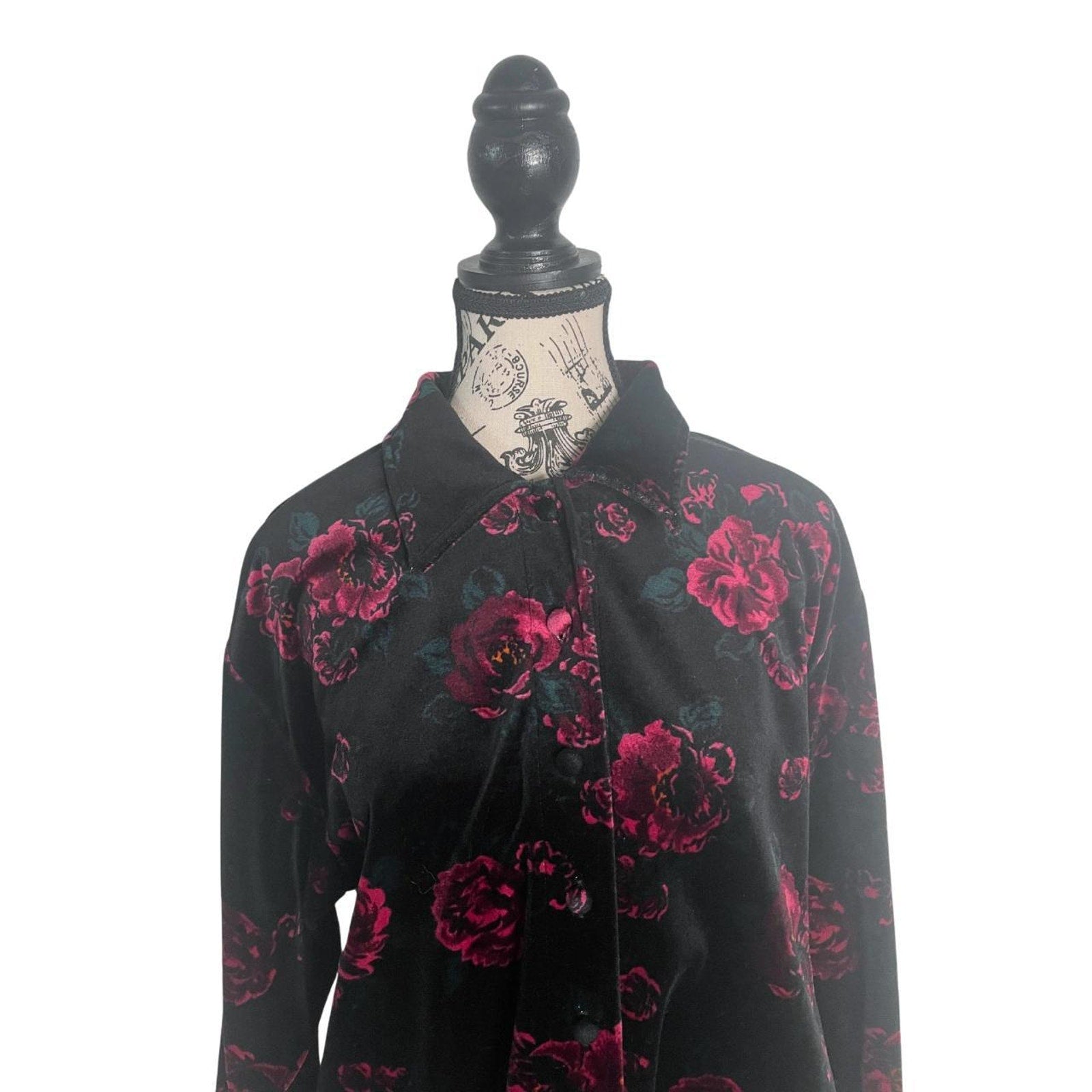 This floral long sleeve blouse is a velvet dream! Perfect for those fall, whimsigoth vibes. Tagged a size medium from the brand Jennifer Moore. Features velvet covered buttons, pointed collar, and rich dark colors.