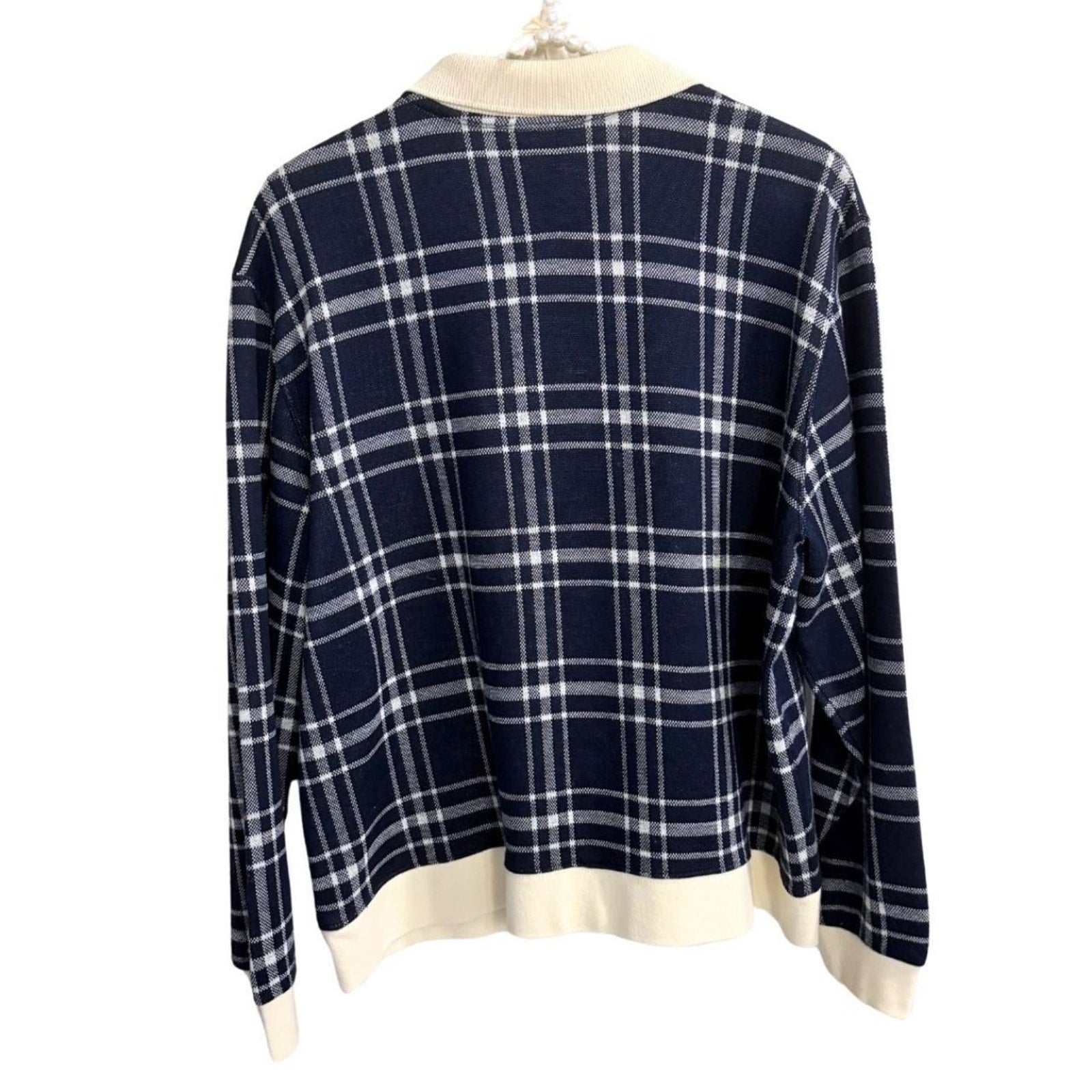 This cardigan features the most darling rope-engraved buttons and cream collar and trim. Tagged a size large from the brand C.D. Petites.