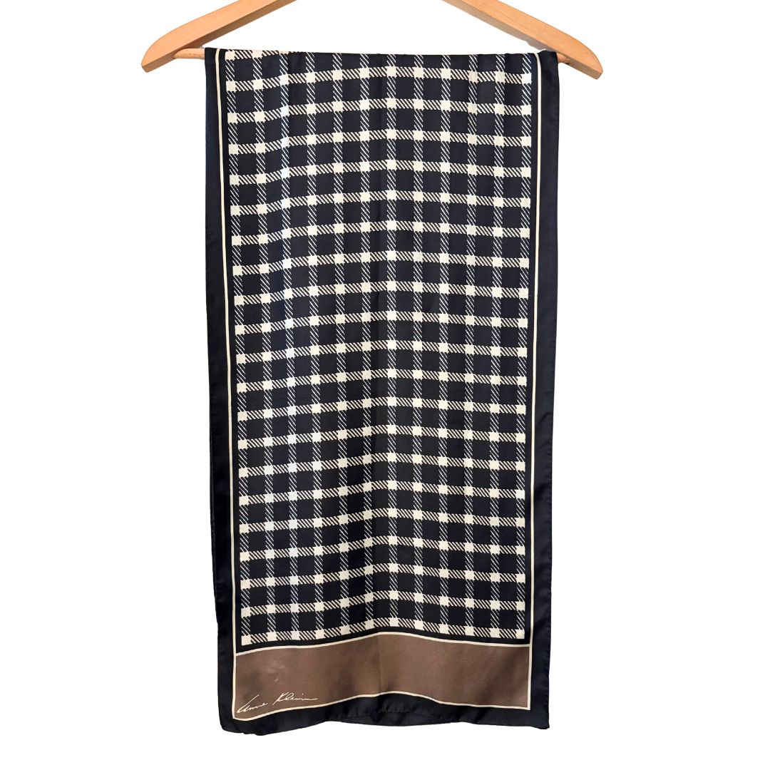 This vintage silk scarf from Anne Klein features hand rolled and stitched edges, a classy checkered print, and a black, white, and brown color palette, making it the perfect accessory for fall. Wear as a neck scarf, head wrap, or tie around bags for a trendy look.
