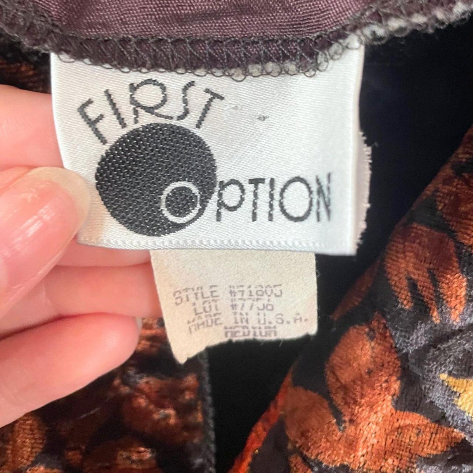 Jazz up your wardrobe with this floral printed velvet blazer. This unique jacket features diamond stitching and large gold buttons. However, the very top button is missing. Tagged a size medium from the brand First Option.